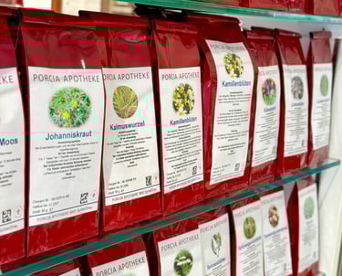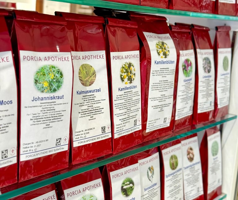 Unsere hauseigenen Tees werden mit größter Sorgfalt und Liebe zum Detail direkt in der Porcia Apotheke abgefüllt. Jede Sorte stammt aus kontrolliertem Anbau und wird nach bewährten Rezepturen ausgewählt – für natürliche Unterstützung bei verschiedensten Beschwerden oder einfach für einen Moment des Wohlbefindens.